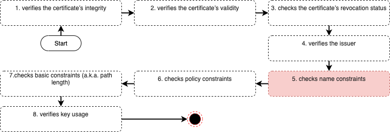 Basically, clients will iterate through all certificates in the path starting with the trust anchor (i.e. the root certificate), validating each certificate’s basic information and critical extensions.